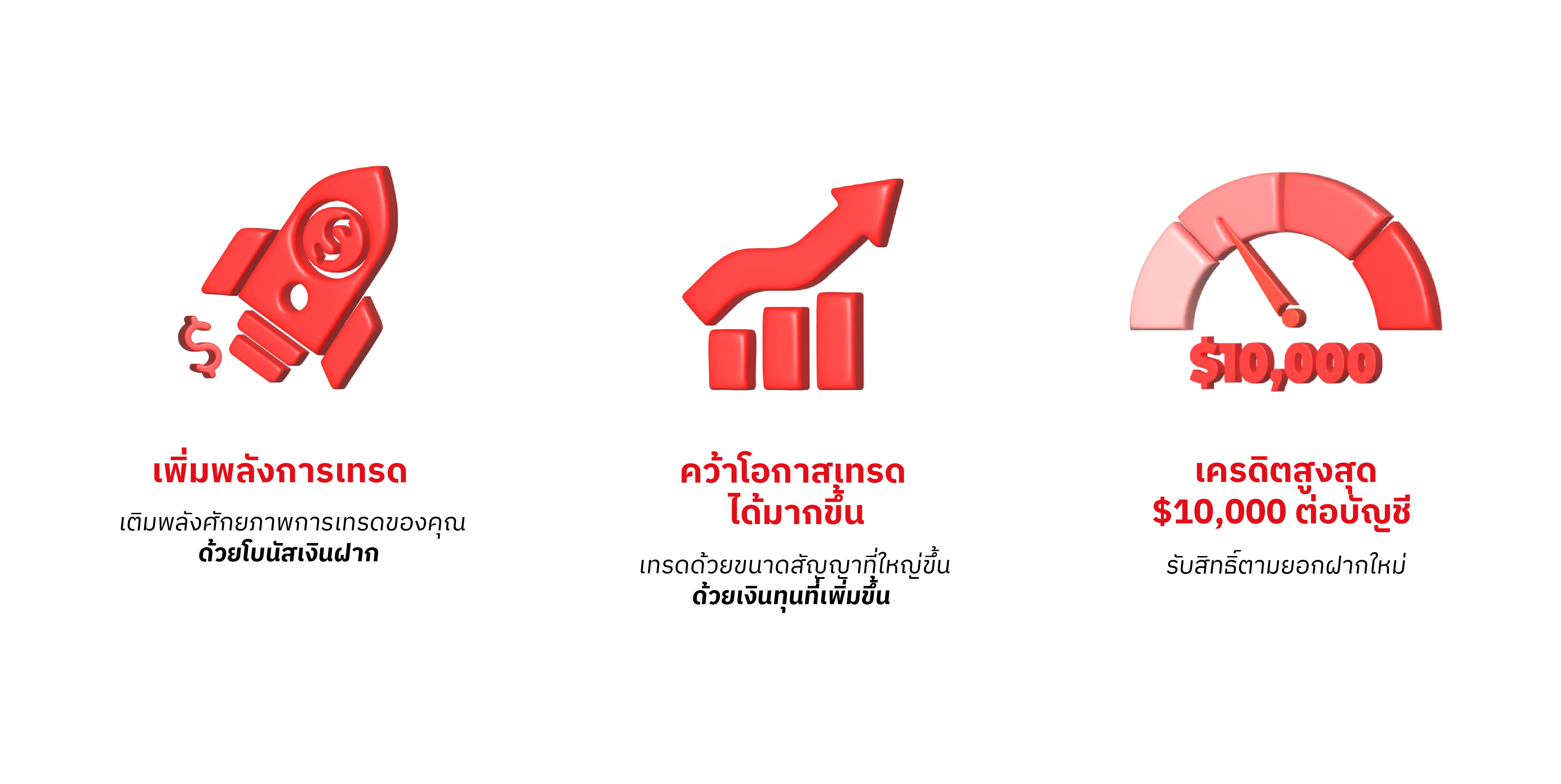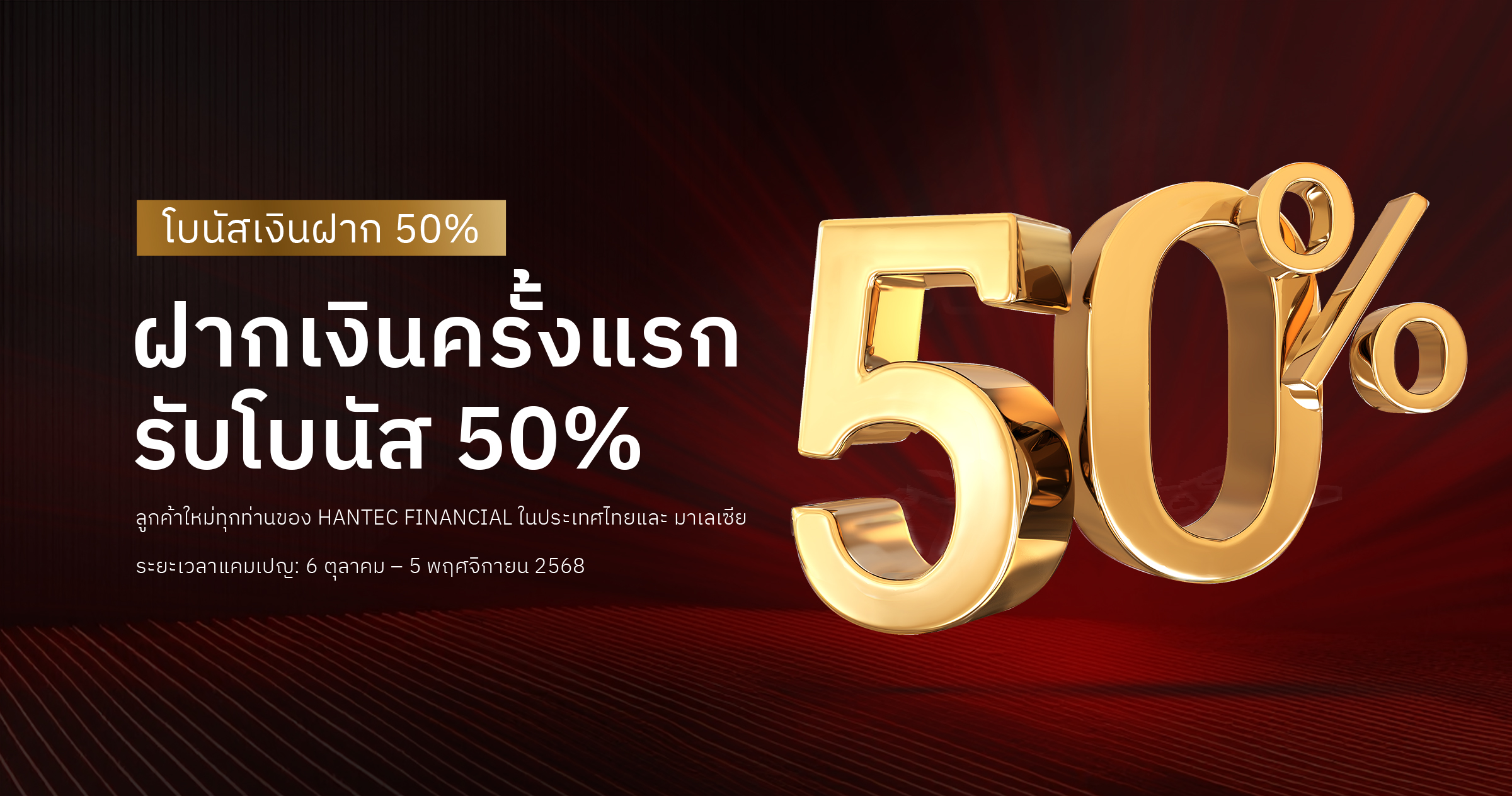 สำหรับเงินฝากครั้งแรกที่ทำในช่วงระยะเวลาแคมเปญ ลูกค้าจะได้รับเครดิตเทรดเท่ากับ 50% ของยอดฝาก โดยจำกัดเครดิตสูงสุดที่ 500 ดอลลาร์สหรัฐ